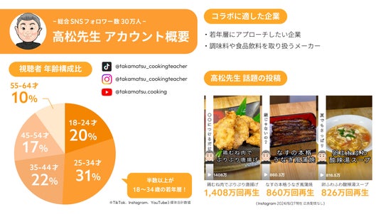 「高松先生タイアッププラン」は調理師専門学校の現役の先生である高松先生が商材に合わせて「簡単レシピ」を考案・投稿まで一気通貫でサポートします。アカウントは、半数以上の視聴者が若年層で構成されており、調味料や食品飲料を取り扱うメーカーと大変相性が良いです。