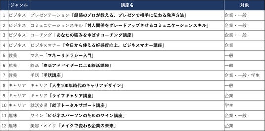 ご提供する講座は、ビジネススキルや教養を身につけるものからワインや美容などの趣味をテーマにしたものまで、幅広いラインナップをご用意しています。