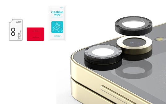 ●端末に搭載している2つのカメラレンズそれぞれにかぶせて保護する、セパレート式カメラ専用強化ガラスフィルムです。ヘアライン加工のアルミメタルフレームが上品なデザインです。