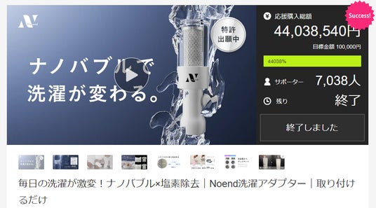 今年3月にクラウドファンディングMakuakeの先行販売にて4,400万円を達成した『オーガニックファインバブル洗濯アダプター』