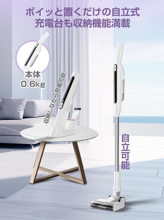 EB102は自立式の掃除機で、収納場所を選ばず、充電も簡単に行えます。掃除中に突然の電話があっても、すぐに立てかけることができ、ストレスなく使用できます。付属のハンディ掃除機用の充電台も便利で、ノズル類もコンパクトに収納可能です。