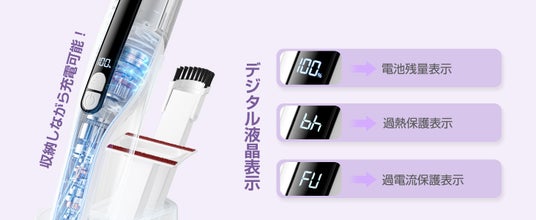 EB102はUSB Type-Cでの充電が可能で、スマホの充電ケーブルと共用でき、充電効率も大幅に向上しました。100Vから240Vの広い電圧に対応しており、国内外問わず安心してご使用いただけます。また、パーセンテージで電池残量を表示する液晶ディスプレイにより、残量確認も一目瞭然です。