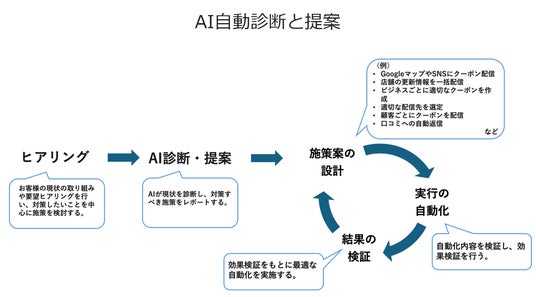 現状の課題をヒアリングさせて頂いたうえで、AIがマーケティング状況を学習し、対策すべき施策をレポーティング。施策案の設計から実行・検証までを一気通貫で行うことで、会社毎に最適なマーケティング手法の調整を行っていくことで、集客やプランディング効果を最大化してきます。