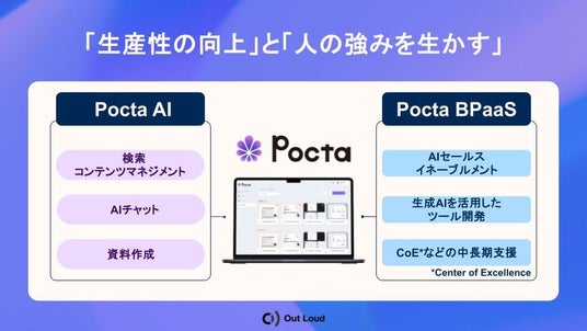 アウトラウドは「人とAIの協業を常識にする」をビジョンに、法人営業の中でもエンタープライズ営業(アカウント営業)に特化したサービスとしてPocta AI、Pocta BPaaSを提供しています。