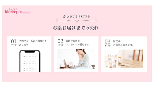 「キレイレポオンラインクリニック」は、スマホで簡単に医師の診察と処方が受けられ、治療薬が自宅に届く、オンライン診療サービスです。