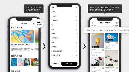 価格、サイズ、カテゴリーなどの絞り込みに加えて、スタイル、素材や技法、色、形状、展示方法での絞り込み機能が追加され、よりお客様のお好みや条件にフィットした作品を探しやすくなりました。