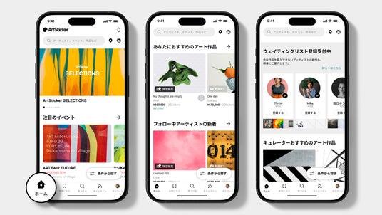 これまでのタイムラインに代わって、作品・アーティスト・イベントなどArtStickerの今注目のコンテンツを表示。パーソナライズ化したおすすめのアート作品、フォロー中アーティストの作品、キュレーターによるセレクションなど、あなたにぴったりのコンテンツをより見つけやすくなりました。