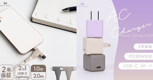 MOTTERU これさえあれば間違いなし!PD30Wの軽量&コンパクト USB-CポートAC充電器と便利な2in1ケーブルに新色が登場