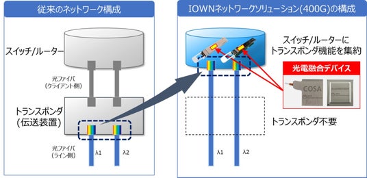 図3.「IOWNネットワークソリューション(400G)」におけるトランスポンダ機能のスイッチ/ルーター集約