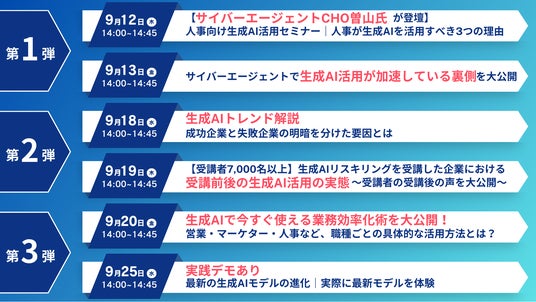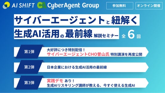 株式会社サイバーエージェント(本社:東京都渋谷区、代表取締役:藤田晋、東証プライム市場:証券コード4751)の100%子会社で、生成AIを活用した業務改革を総合的に支援する株式会社AI Shift(本社:東京都渋谷区、代表取締役社長:米山結人)は、サイバーエージェントCHO曽山氏が解説する生成AI活用セミナーに加え、生成AIに関する最新情報から実践的な活用事例を公開するオンラインセミナーを開催いたします。
