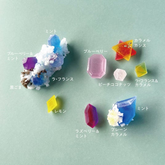 9月のBOXでは、母岩付き原石や宝石型など、さまざまな色と形でサファイアを表現。ミントの葉を煮詰めて作った自家製ミントシロップで味付けしたミント味はスッキリとした優しい味に仕上がっています。