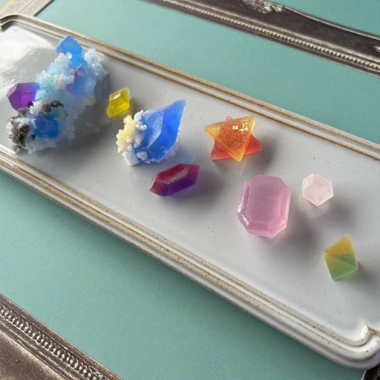 ひとつひとつ小刀で宝石や鉱物の形に切り出して、組み上げる。キャンディのように硬そうに見えるが、外側は砂糖が結晶化した薄い膜が張り、シャリっとした食感。中は寒天ゼリーのように弾力のあるゼリーのような食感。