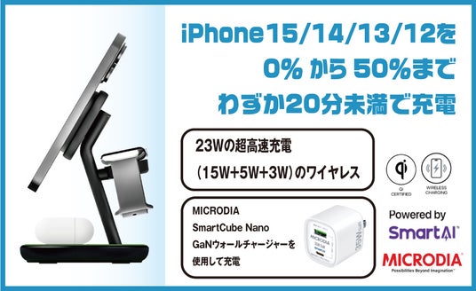 SnapStation PLUSは、iPhoneに15W、Apple Watchに3W、AirPodsに5Wの出力を提供します。iPhone 15/14/13/12をわずか20分以内で0%から50%まで充電できます。(**MICRODIA SmartCube Nano GaNウォールチャージャーを使用した場合)