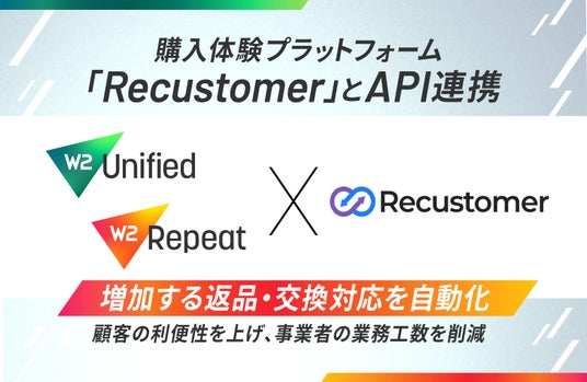 Recustomer株式会社(本社:東京都千代田区、代表取締役:柴田康弘)が運営する購入体験プラットフォーム「Recustomer(リカスタマー)」はEC事業の「成功」にこだわる最先端ECプラットフォームを展開するW2株式会社(本社:東京都中央区、代表取締役:山田大樹、以下W2)と、API連携したことをお知らせします。この連携により、商品購入後の配送追跡、返品・交換・キャンセル業務の自動化に向けた基盤が整い、大幅なコスト削減と高い購買体験の提供により、EC事業の売上向上・業務効率化を可能にします。