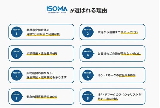 株式会社ISOMAは、企業様のISO/Pマークの各種規格の新規認証・運用について、コンサルティング及び運用をワンストップで対応できるサービス「ISO MANAGEMENT AGENCY」を提供しております。
