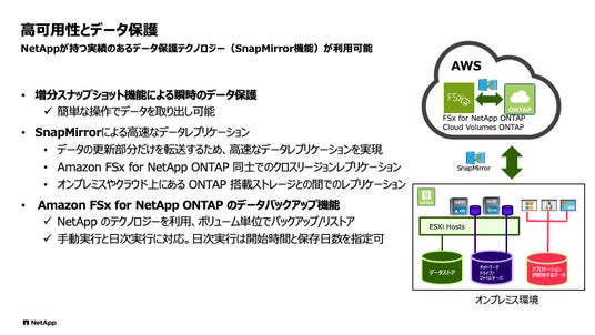 すでに岐阜市役所においては高可用性とデータ保護の観点でNetAppが持つ実績のあるデータ保護テクノロジー(SnapMirror機能)をオンプレミスとAmazon FSx for NetApp ONTAP間でレプリケーションすることで、万が一の災害に対する対策も実装しています。