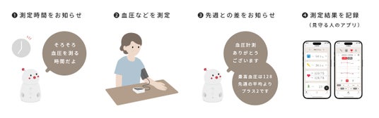 当サービスに対応したヘルスケア機器を使用して血圧や体重などを測定すると、BOCCO emoが「計測ありがとう」の一言を添えて先週の平均値との差をお知らせします。スマートフォンを使えない高齢者でも簡単に計測値の変化を知ることができます。
