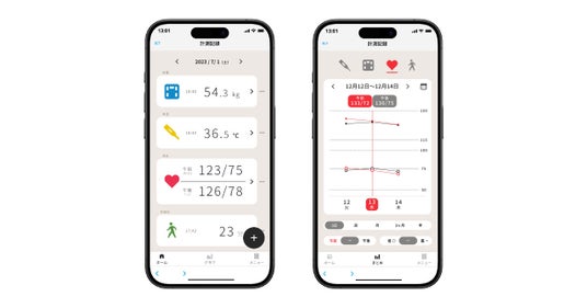 血圧計や体重計などで測定した結果を自動記録