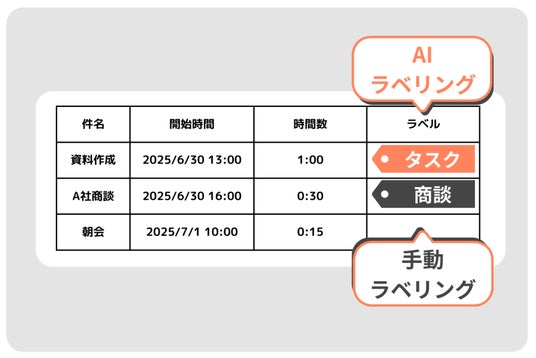 fukucale工数管理では、手動で工数を把握することのほか、日常で登録する予定の件名や、内容、招待者などの情報をもとに、当該予定が、どのような予定なのかをAIで推測し、ラベリングを行うことができます。