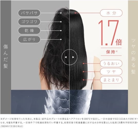 通常高温の鉄板に水を吹きかけると「ジュー」っと音を立てて”水蒸気爆発”が起こってしまいますが、本商品はスムース保水フィルムにより高温でも蒸発しにくいので髪の水分をしっかり守ります。
