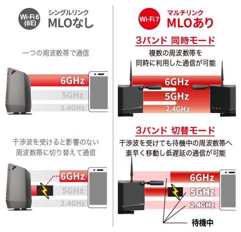 ※1 本説明は、MLOの3バンド 同時モード(MLMR:Multi-Link Multi-Radio)についてのものです。端末側も対応している必要があります。