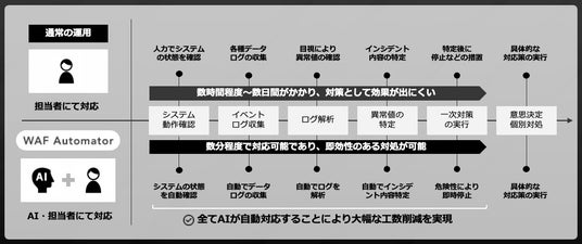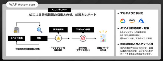 WAF AutomatorはパブリッククラウドサービスのWAF機能の導入からポリシーの展開、そしてAI活用、自動化によるセキュリティ運用を提供します。AI活用により手間がなく運用が可能で、AIがインシデントをいち早く検知し、即座にルール変更を行い継続する攻撃を防御します。またクラウドサービスとしてパッケージ化することで安価で高度なセキュリティを提供すると同時に専門性の高い技術者による支援を行います。