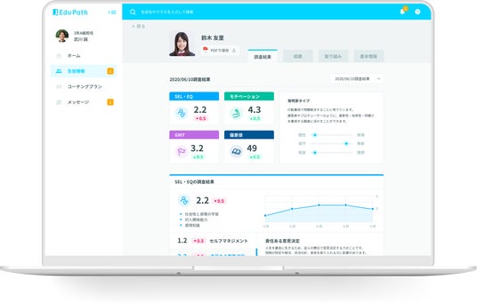 生きる力を育む成長型支援サービス「Edv Path(エデュパス)」は、「非認知能力(ポテンシャリティー)」に着目し、主体的な学びと自律的な進路選択を実現するため、生徒一人ひとりの非認知能力を可視化・数値化し、データとして蓄積することで、生徒の成長支援を行い、最適なカリキュラムとコーチングを提案するアカデミックアドバイスソフトウェアです。