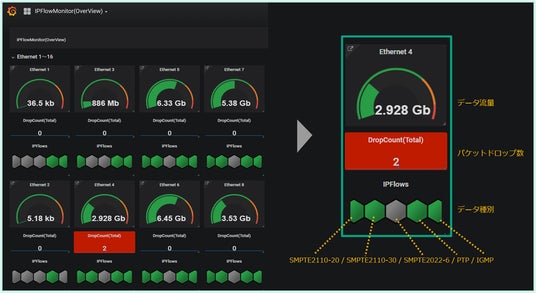 拠点間を流れるIPフローの通信状況をリアルタイムに監視・可視化する製品です。放送の IP 化において標準規格となっている SMPTE ST2110、ST2022 をはじめとした主要なデータ種別や、数千Gbpsを使用する大規模ネットワークに対応しています。また、障害時の原因把握やリアルタイムでのデータ分析・可視化を実現することで、IP 化された放送システムの運用コストの大幅な削減に貢献します。