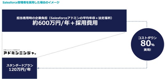 Salesforce管理者を新規に採用する場合、平均年収600万円程度に加え、法定福利や採用費用が発生し、年間で約600万円以上のコストがかかります。しかし、「アドミンニンジャ」を導入することで、年間120万円のみの外注費で済み、約80%のコスト削減を実現可能です。また、採用活動やトレーニングの手間もなく、導入後すぐにプロフェッショナルのサポートを受けることができます。