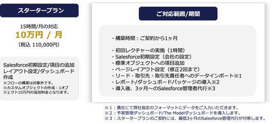 また「Salesforceの導入を最低限のコストでご支援いただきたい」というお声も多数いただいており、別途「Salesforce導入スタータープラン」もご用意しております。