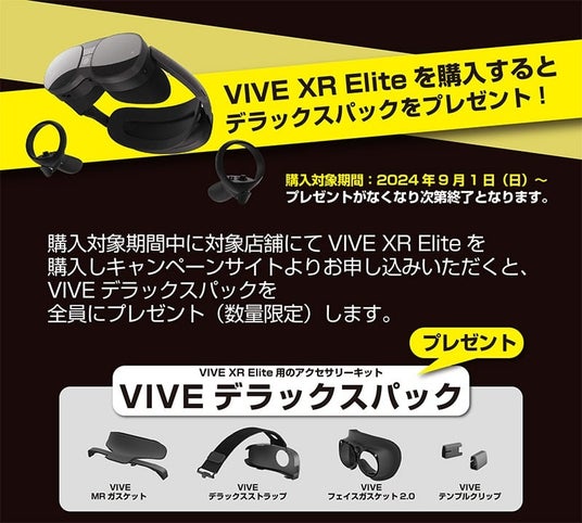 キャンペーン内容:購入対象期間中に対象店舗にてVIVE XR Eliteをご購入の上、キャンペーン申込ページよりご応募いただいた方全員に、VIVEフェイスガスケット 2.0、VIVE MRガスケット、VIVEデラックスストラップ、VIVEテンプルクリップを詰め合わせた「VIVE XR Eliteデラックスパック」をプレゼント。