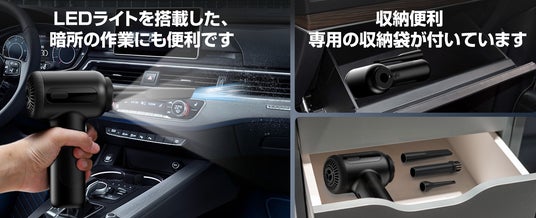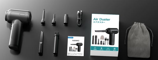 このエアダスターは、わずか340gの軽量設計で、片手での操作が簡単。サイズもコンパクト(8×8.4×18.5cm)で、どこでも持ち運びやすく、場所を選びません。自宅での家事の合間、オフィスでのデスク周りの清掃、さらには旅行先でのちょっとした掃除にも最適です。専用の収納袋が付属しているため、コンパクトに収納でき、持ち運びも快適です。
