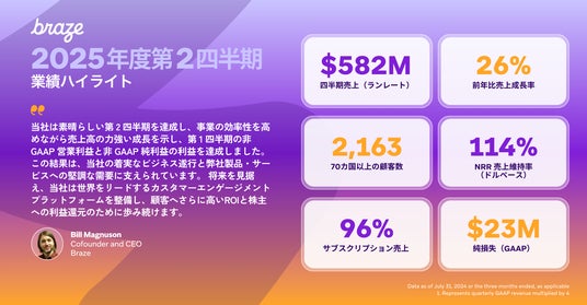 - Braze は、2024年10月31日終了の会計年度第 3 四半期の見通しを開始し、2025年1月31日終了の会計年度の見通しを更新しています。