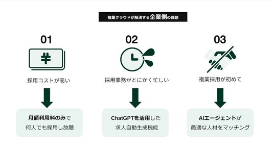 「複業クラウド」は、複業したい個人(タレント)と企業や自治体を繋ぐ総合型の複業マッチングプラットフォームです。企業は毎月定額料金で求人掲載が可能。採用が実現しても成約手数料は一切かからないため、採用コストが削減できる今までにないサービスです。マッチングデータを分析したAIエージェント「Nico」が採用活動のDXを支援します。タレントは登録・利用が一切無料で、求人へ直接エントリーが可能。企業との直接契約なので、中間マージンもかからず原価で案件を受けることができます。企業からのスカウトが届くこともあるので、登録するだけで複業の機会を最大化させることができます。