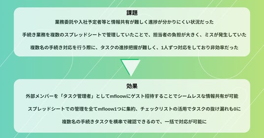 そのなかで、「mfloow」は部署や社内外を横断して業務を行うバックオフィスに特化しており、タスクや進捗が一元管理できる点や、委託先の担当者や入社前のメンバーなど初めて利用する人でも直感的に分かりやすいシンプルさを評価いただき導入に至りました。