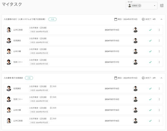 業務委託も含めて毎月10名程の入社がありますが、複数人の手続きタスクを横串で確認できるので、まとめて効率良く対応できるようになりました。また、リマインド機能によってタスクの対応漏れが無くなりました。