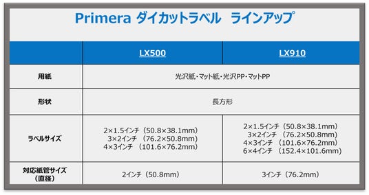 「LX500」「LX910」の取り扱い開始に合わせ、各機種でご利用いただけるダイカットラベル(予め四角などの形状に型抜きされたラベル)の取り扱いも開始いたしました。以下の標準基材・サイズのラインアップに加え、ご要望に応じたサイズ・仕様のラベル作成のご相談も承ります。