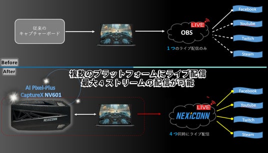 「AI Pixel-Plus CaptureX NV501 & NV601」は、マルチプラットフォームでのストリーミング機能を搭載し、既存の制約を打破しました。これにより、コンテンツクリエイターは、よりクリエイティブで革新的な配信を行うことができるようになります。
