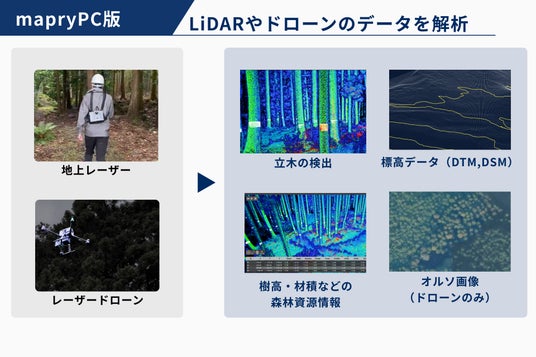 「mapryPC版」はLiDARやレーザードローンで計測した点群データを解析できるデスクトップアプリです。立木の樹高や材積の取得、DTMなどの地形データの取得、オルソ画像の作成などが可能で、森林資源量調査や建築現場での現況管理にご利用いただけます。