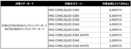対象のMSI Z790/B760/X670/B650チップセット搭載マザーボードと対象のMEGシリーズ/MPGシリーズ/MAGシリーズの水冷クーラーを購入して本キャンペーンに応募すると2,000円~最大6,000円分のえらべるPayがもらえます!