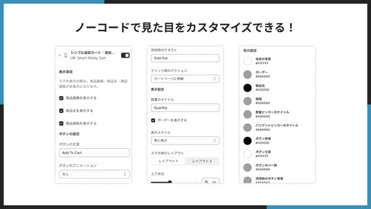 「シンプル追従カート|追従購入ボタン(Buy Button)」は、ノーコードで見た目をカスタマイズできます。