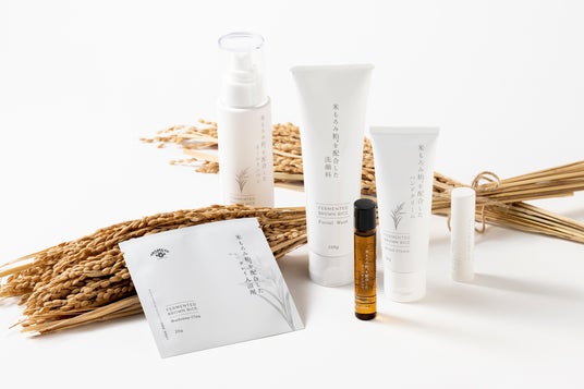 岩手県奥州市の休耕田で育てたオーガニック玄米に、酵母・麹を加え発酵させてつくった米もろみ粕*を使用したサスティナブルなスキンケアシリーズ。