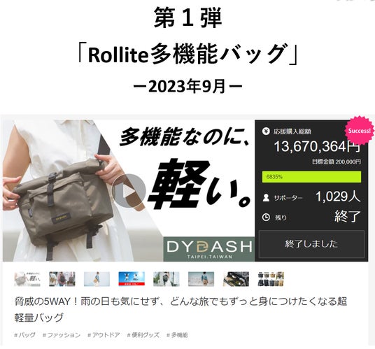 12“Mixバッグの前作となる「Rollite多機能バッグ」は、昨年9月より開始した先行予約販売にて、1,300万円を超える応援購入を集めました。台湾製バッグのプロジェクトとしては異例の大ヒットで、1,000人以上のサポーター様より応援購入を頂いております。