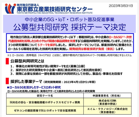 本出展は昨年、東京都立産業技術センターにて募集を行いました公募型共同研究のうち、「ローカル5Gを活かしたサービスロボット研究」に弊社が採択されたことがきっかけとなります。