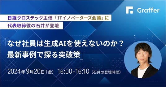 生成AI活用による企業変革を実現する株式会社グラファー(本社:東京都渋谷区、代表取締役:石井大地、以下「当社」)は、2024年9月20日(金)に株式会社日経BP(本社:東京都港区、代表取締役社長:吉田直人、以下日経BP)が運営する日経クロステック主催のカンファレンス「ITイノベーターズ会議 生成AIなどの新技術・製品・サービスを使いこなす DXの手段に振り回されないための要諦」に当社代表取締役の石井が登壇することをお知らせします。