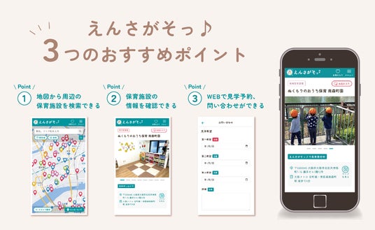 保護者は、「えんさがそっ♪」を利用することで、自宅や現在地付近の保育施設を地図上で簡単に検索できたり、気になる保育施設をお気に入り登録して後からまとめて見返せたり、お問い合わせや見学の申し込みをすることができます。