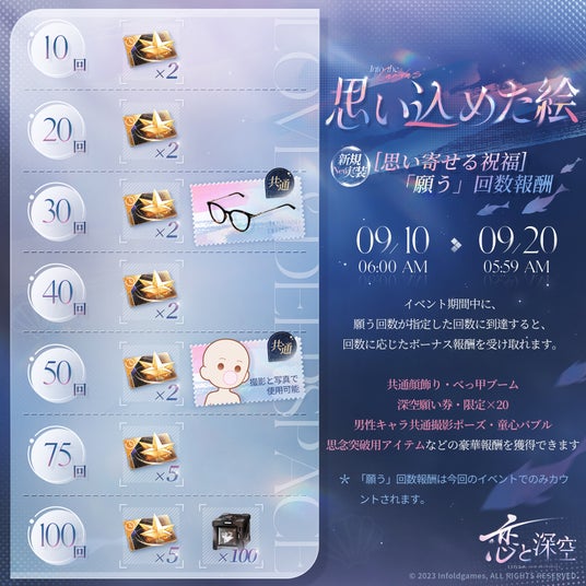 ■イベント説明:イベント期間中、願う回数が指定の回数に到達すると、共通顔飾り【べっ甲ブーム】、【深空願い券・限定×20】、男性キャラ共通撮影ポーズ【童心バブル】、思念突破用アイテムなどの豪華報酬を獲得できます。