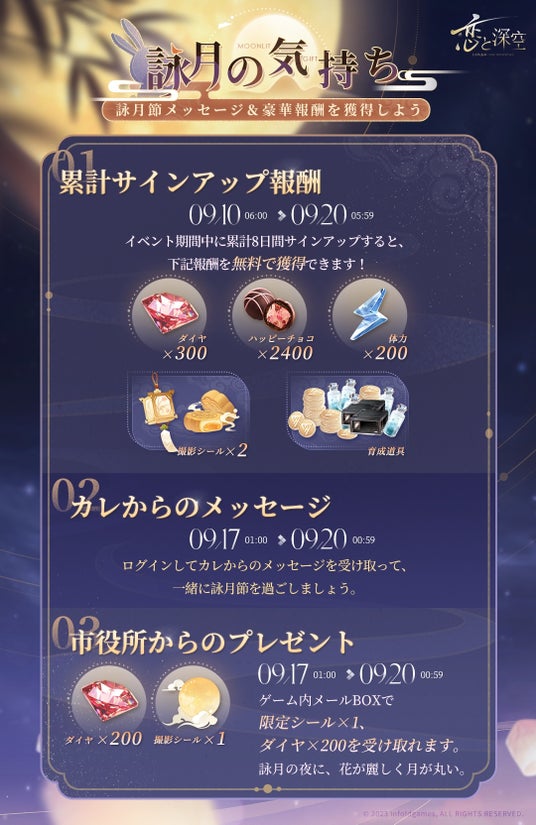 ■イベント説明:イベント期間中、ゲームにログインしてイベントページでサインアップすると、カレからの詠月節メッセージ、限定シール&豪華報酬を無料で受け取れます。