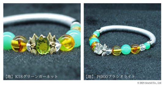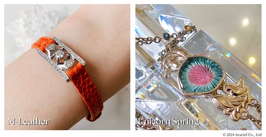 (左)時計ベルトの新感覚ジュエリー「M-Leather」・(右)2頭のユニコーンが人生に奇跡をもたらす天然石ジュエリー「ユニコーンの泉ブレスレット」