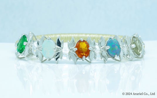 地「グリーンガーネット」、水「オパール」、火「オレンジガーネット」、風「ブラックオパール」、空「ダイアスポア」と水晶を組み合わせた、五つのエレメントが揃う特別モデル。